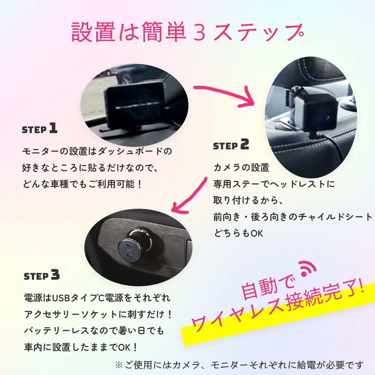 1カメラをヘッドレストに取り付ける!2ダッシュボードにモニターをセット!3シガーソケットに電源を挿す!