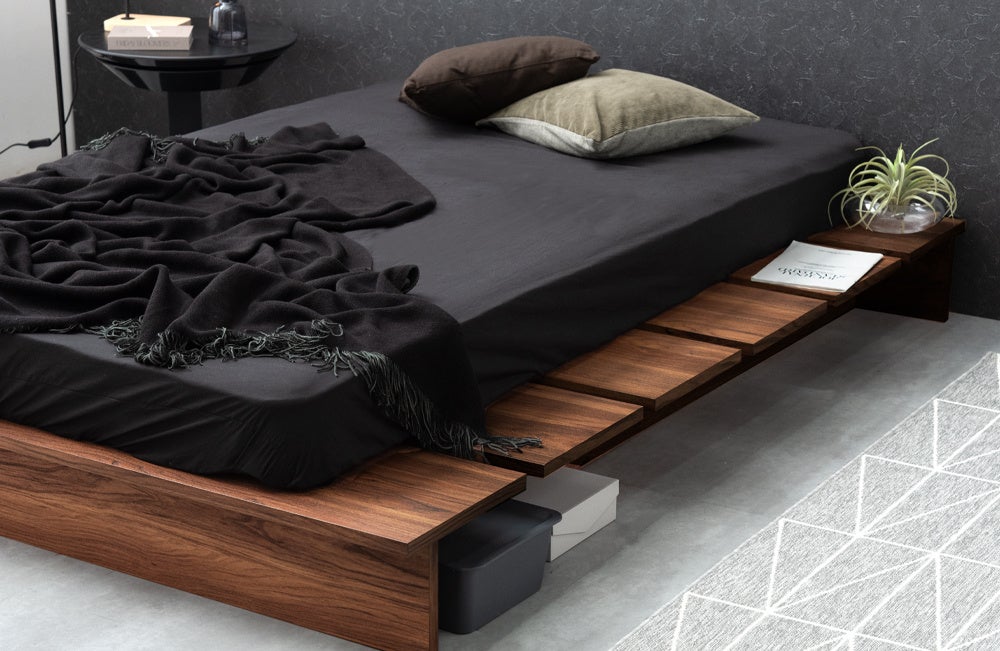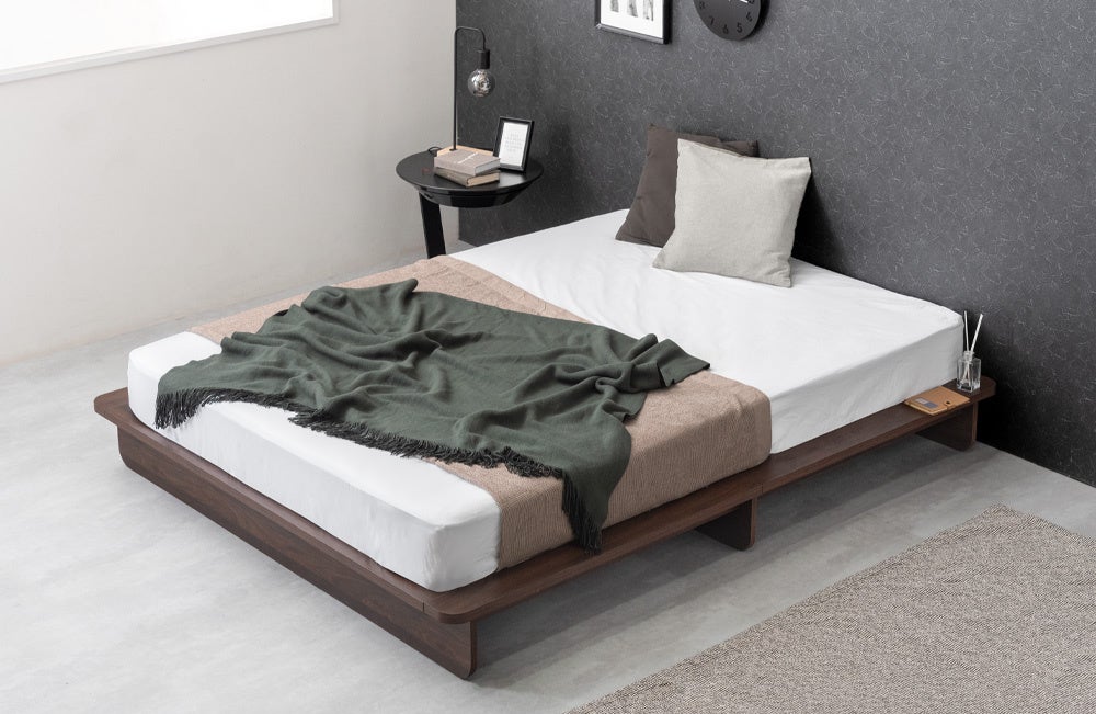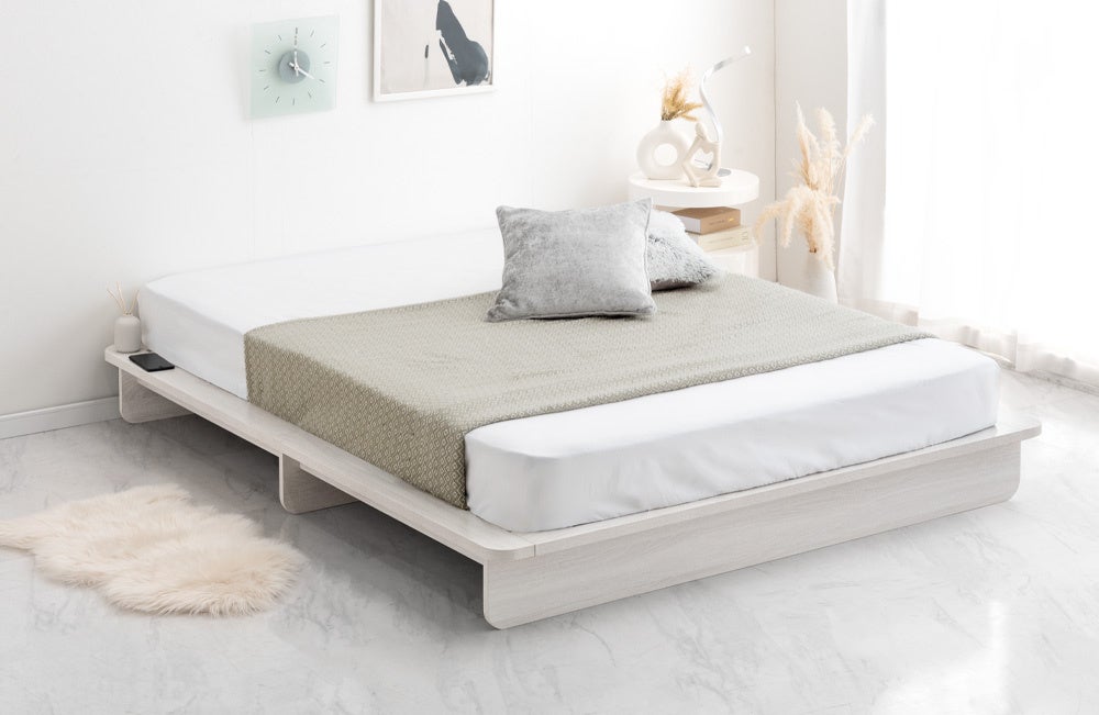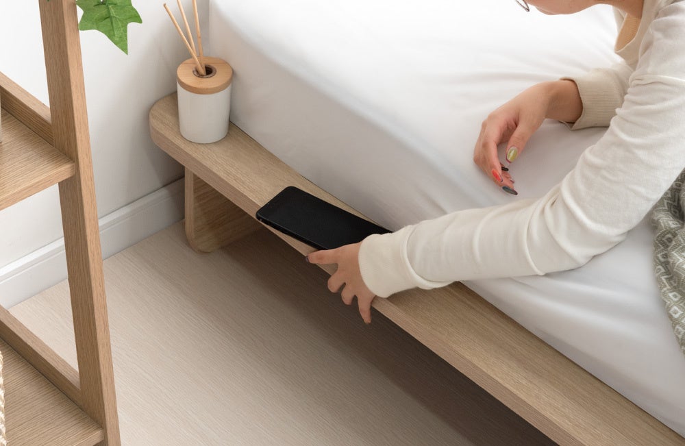 ステージベッドとはサイドフレームがマットレスより大きいベッドのことで両サイドにスペースがあるベッドのことを指します。一般的なベッドフレームはマットレスとフレームサイズが同様のものが多いですが、サイドに10~20cm程度のスペースがあるため小物やちょっとした小上がりとして使えるのが特徴です。