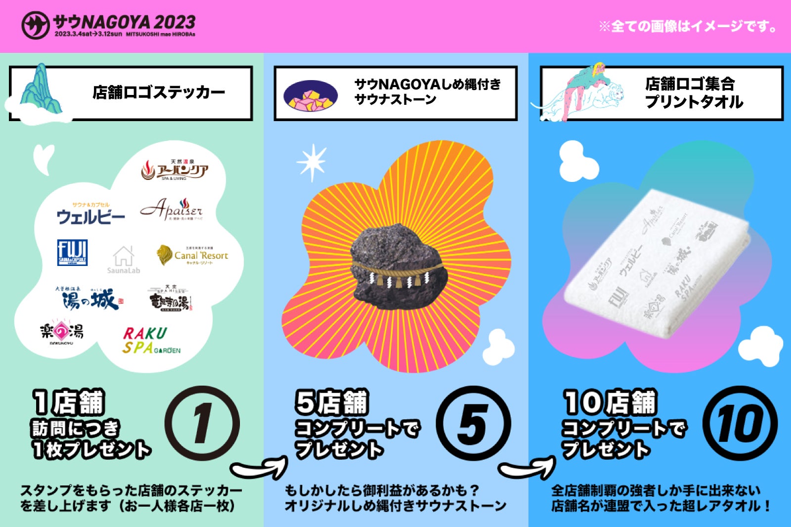 今回の目玉は、名古屋の人気サウナ店10店舗の全面協力で実現したコラボ企画。開催期間を含む、3月4日(土)~3月31日(日)の期間内に、お店を巡れば巡るほど、限定のオリジナルグッズが手に入るスタンプラリー企画を実施いたします。