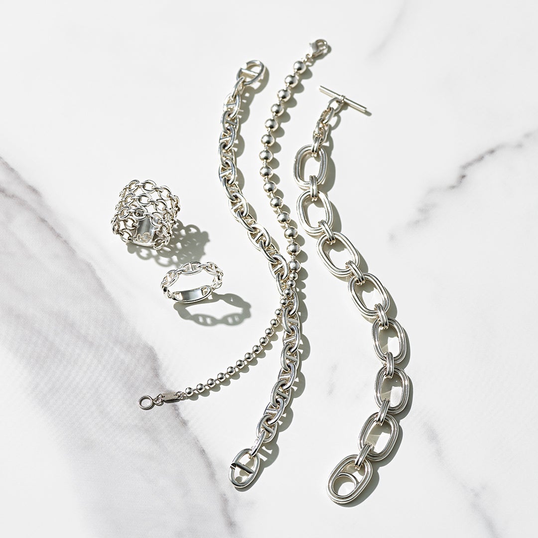 ブランドのアイコンである「チェーン」は、ハンドメイドの表情豊かなオリジナルデザインを中心としたコレクション。L.A.H. は、ジュエリーを通じて、型にはまらない、性差の無いデザインで身に着ける人が自由にセレクトし、表現してほしいというメッセージを込めています。