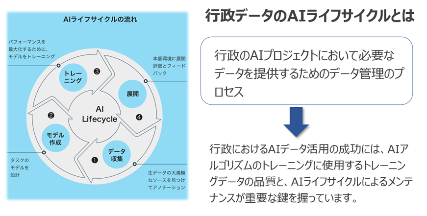 AOS IDXでは、こうしたAIライフサイクルの仕組みに基づき、AIデータにおけるAIシステムのためのAIデータ管理を行い、行政における優秀なデータがあって初めて優秀なAIシステムを実現できるというData to AIのコンセプトの元、AOS IDXによって、行政の効率化に向けたプラットフォーム構築を支援します。