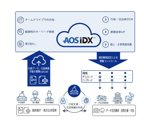 「GovTechデータプラットフォーム AOS IDX」は、厳格かつ柔軟なアクセス権限管理機能や、ドキュメントへの検索用メタデータ付与によるデータ検索性の強化、AIデータ活用に向けたマルチモーダルAIへの対応、ファイルビューアー機能、暗号化および監査機能、バックアップ機能、および大容量長期保管向けアーカイブシステム機能を備えています。AOS IDXは、安全データ共有が求められるすべての行政機関向けに設計されたクラウドストレージシステムです。