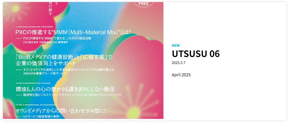Corporate Promotion DX CompanyのPXC株式会社(https://pxc.co.jp/)は、自社が提供するサービスや業界のトレンド情報、その他自社のプロモーション実績などを掲載した、定期情報誌「UTSUSU」のさらなる充実化とオンライン上でのコンテンツ提供を強化したWEBメディア「UTSUSU」のvol.6を公開しました。