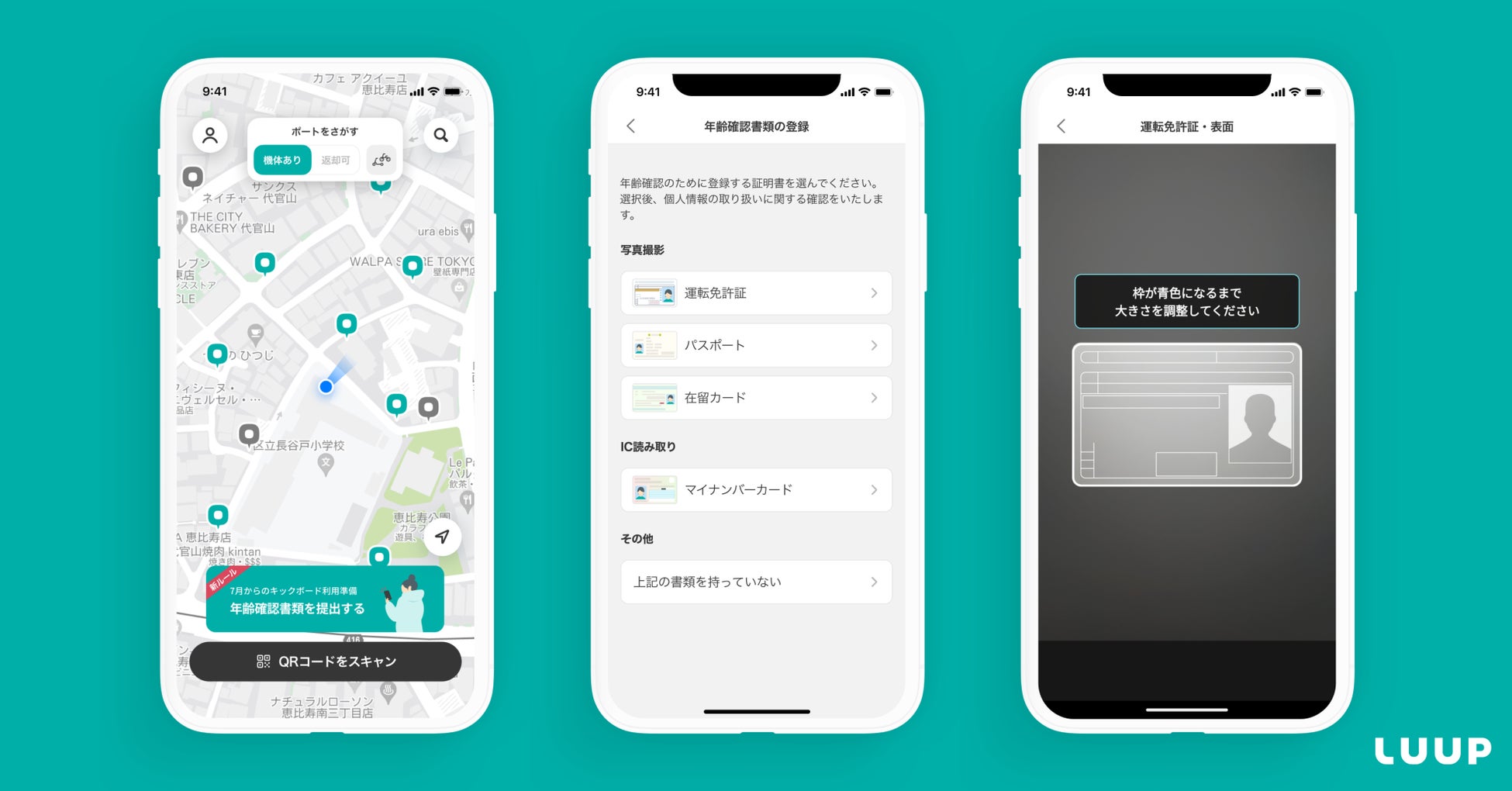 免許不要化にともない、16歳以上であることを確認するための年齢確認書類の提出が必要になります。LUUPでは、6月8日より年齢確認書類の事前提出受付を開始しました。予め年齢確認書類を提出し、電動キックボード利用の事前登録を完了させておくことで、改正道路交通法の施行後にスムーズにLUUPの電動キックボードをご利用いただけます。