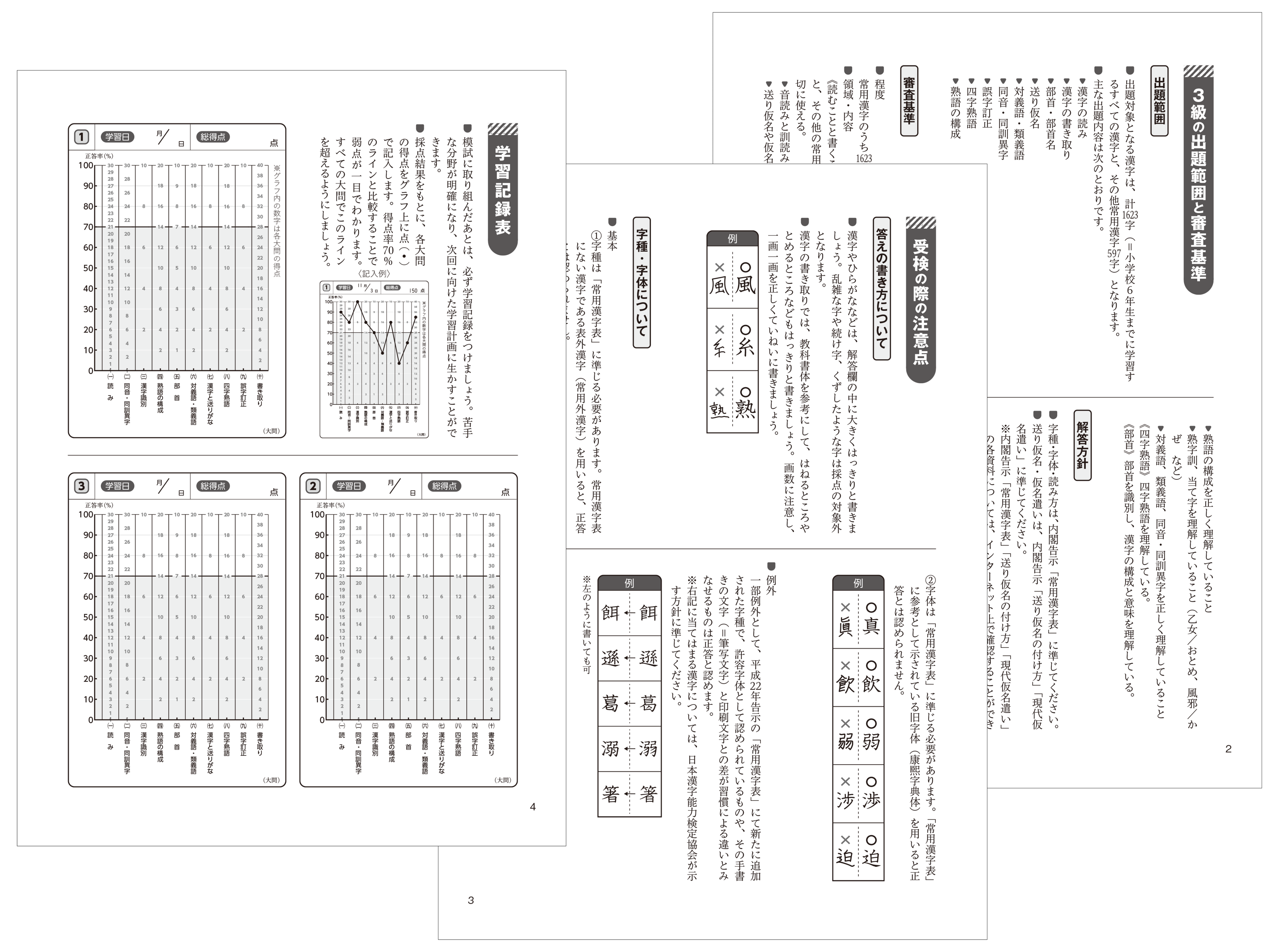 漢字検定を受けるにあたっての注意点や、自己採点の点数を記録する学習記録表つき。自分の弱点が把握しやすくなるので、効率的に学習することができます。