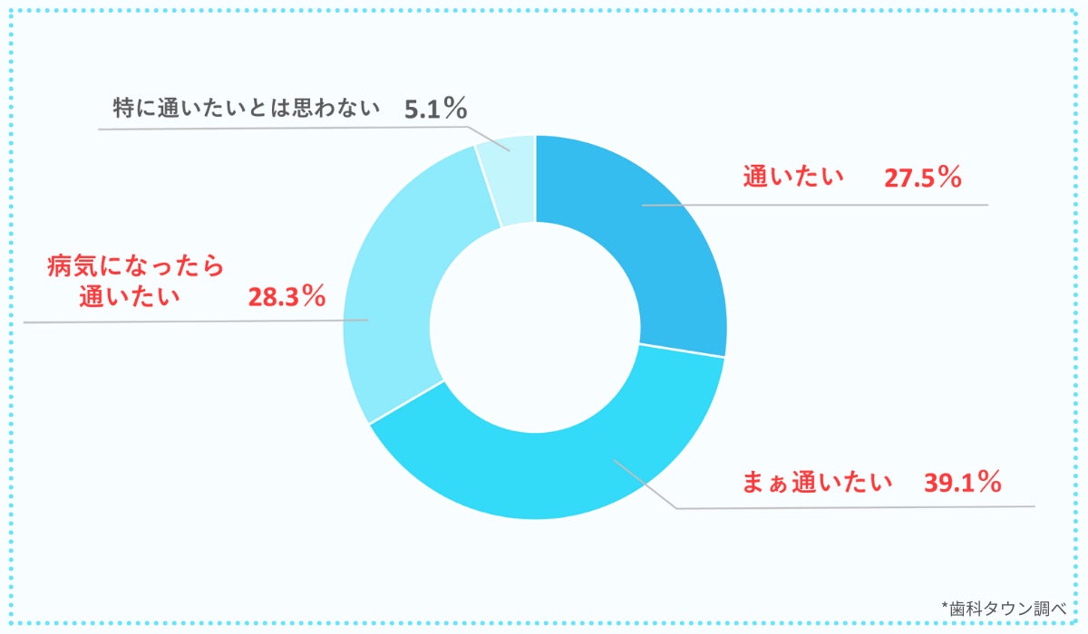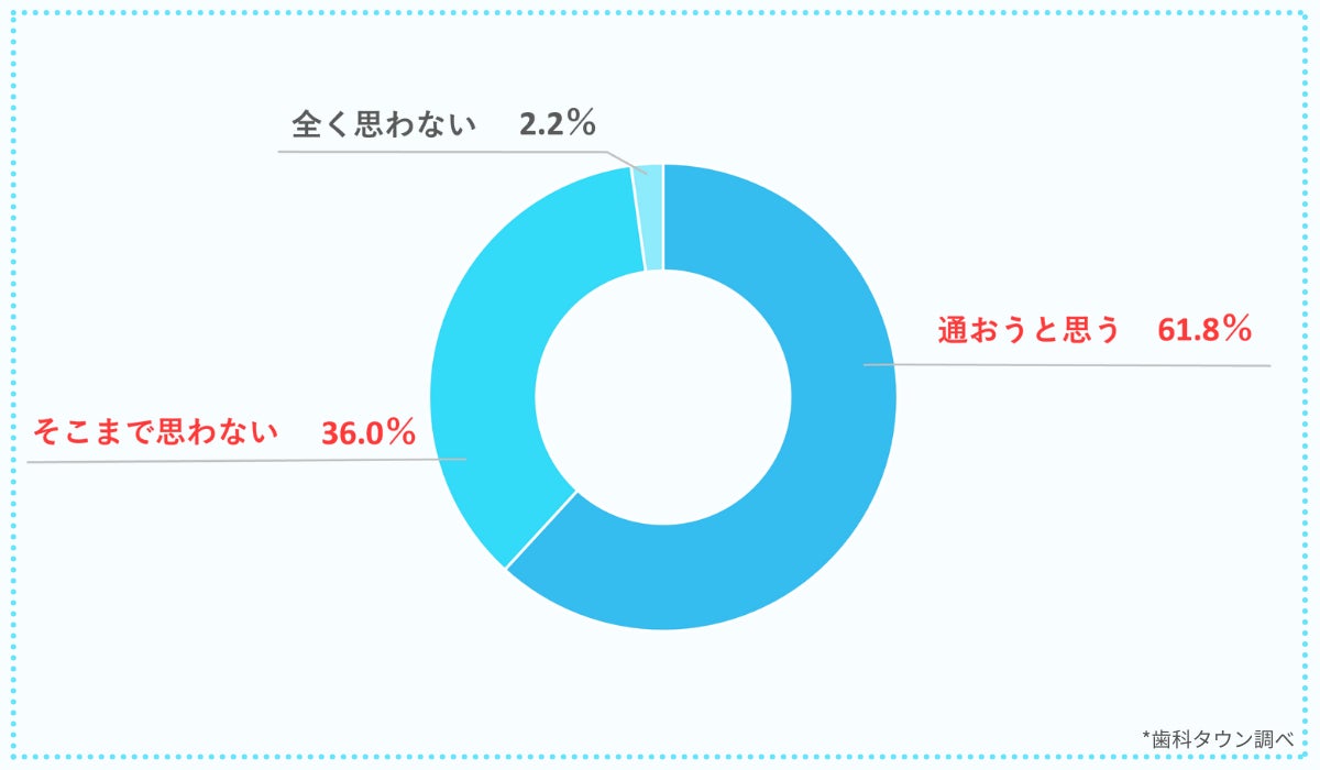 また、「そこまで思わない」と回答した人も36.0%存在していて、病気の予防効果はあると感じつつも、健康な状態の場合は時間をかけて歯科医院に通おうとまでは思わないのかもしれません。ただし、「全く思わない」と回答した人はわずか2.2%であり、何らかのきっかけがあれば多くの人は病気の予防を目的に歯科医院に通う意識を持っていると考えられます。