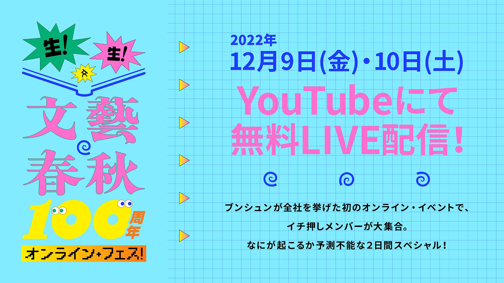 株式会社文藝春秋(本社:東京都千代田区、社長:中部嘉人)は、2023年に100周年を迎えます。そこで、みなさまへの感謝を込めて、文藝春秋全社を挙げた初のオンラインイベント「生!生!文藝春秋 100周年オンライン・フェス!」を2022年12月9日(金)と10日(土)に開催いたします。なお、当日の様子はYouTubeにて無料LIVE配信※いたします。