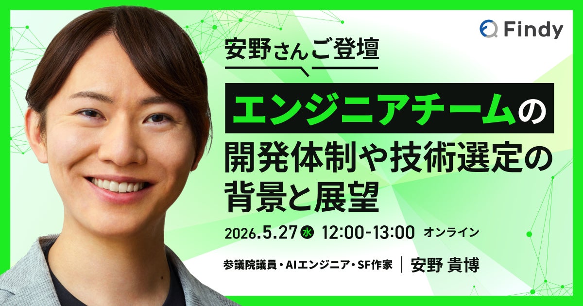 エンジニアプラットフォームを提供するファインディ株式会社(東京都品川区、代表取締役:山田 裕一朗、以下「当社」)は、2026年5月27日(水)に開催するオンラインイベントの参加申し込み受付を、本日より開始したことを発表します。本イベントは、チームみらい党首であり参議院議員の安野 貴博氏をお招きし、エンジニアチームの開発体制や技術選定の背景と展望をお話しいただきます。