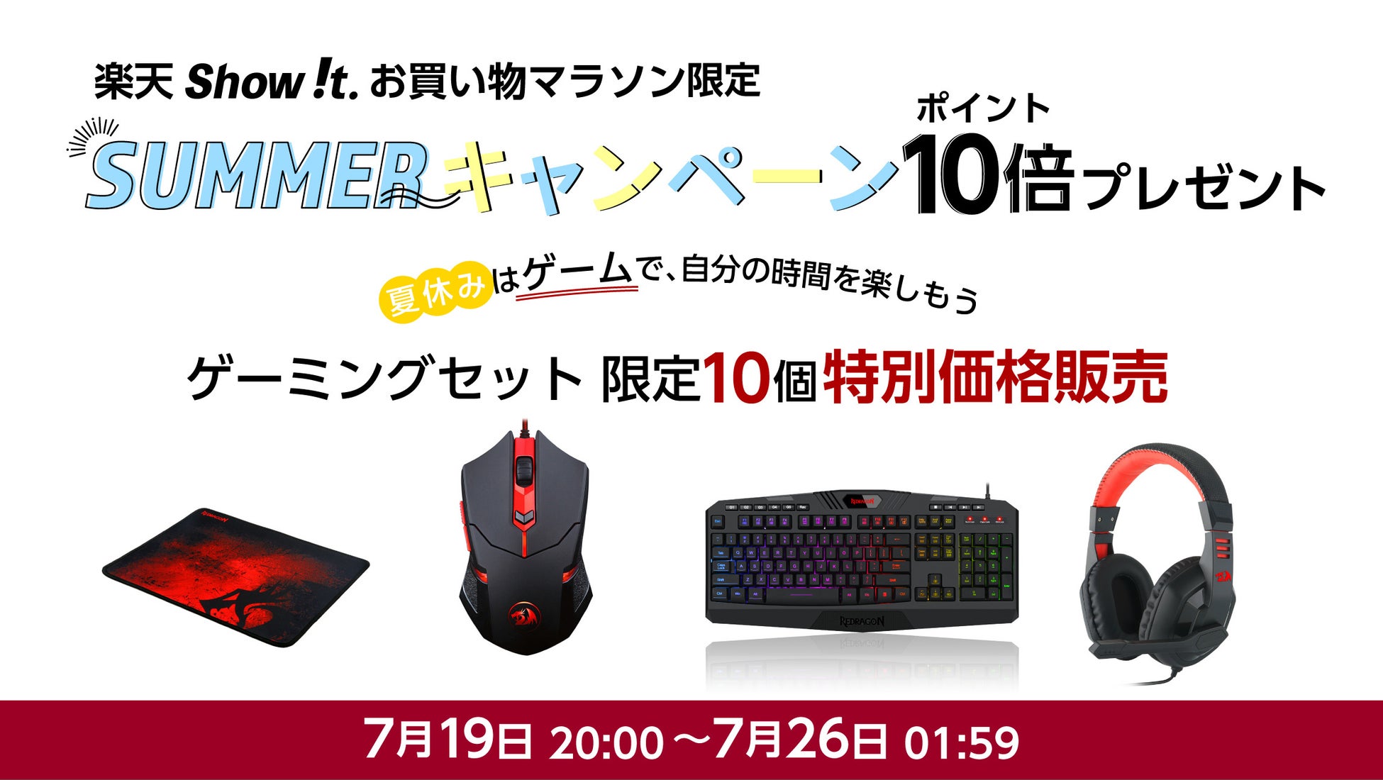楽天市場「Show !t」は7月19日(月)20時から、限定10個「REDRAGON」スターターセットを通常価格から約10%オフのセール価格で販売します。夏休みは涼しい屋内でゲームを楽しみたい方やPCゲームを始める方におすすめのセットです。また、7月19日(月)20時~7月26日(火)01時59分まで開催される、全商品ポイント10倍プレゼント楽天お買い物マラソンに参加します。