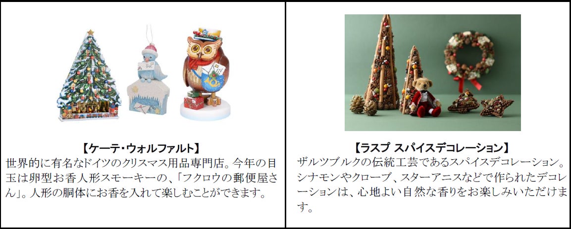 日本ではクリスマスの時期にしか出店されない、本場ドイツのクリスマス用品店「ケーテ・ウォルファルト」をはじめ、多彩なお店が出店。お香人形“スモーキー”やオーナメント、リースなど、クリスマスシーズンのお部屋を彩る雑貨を販売します。