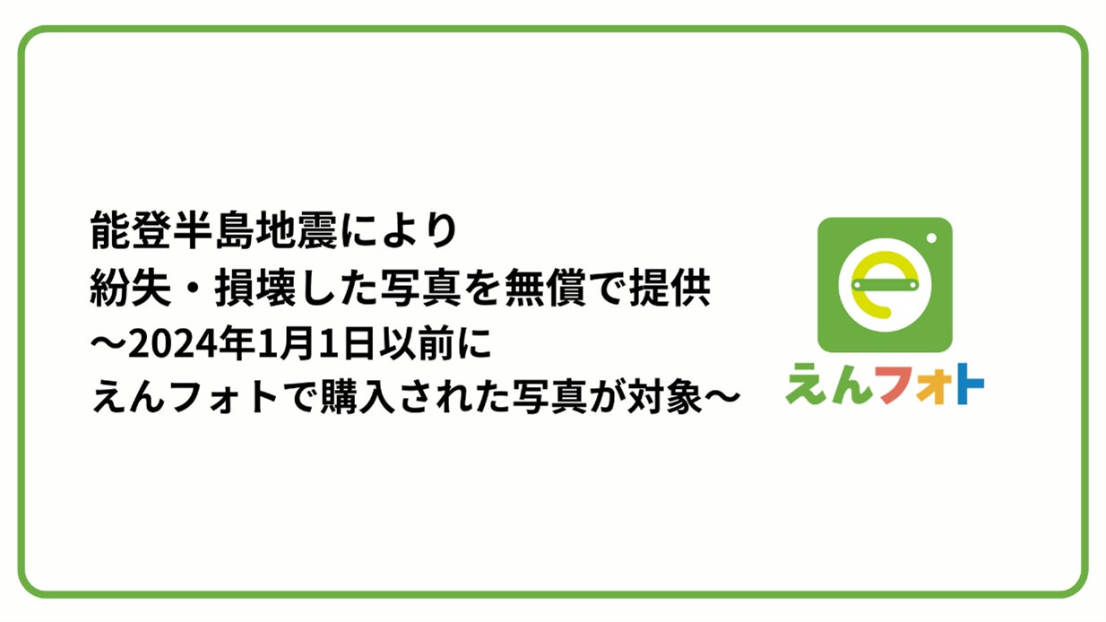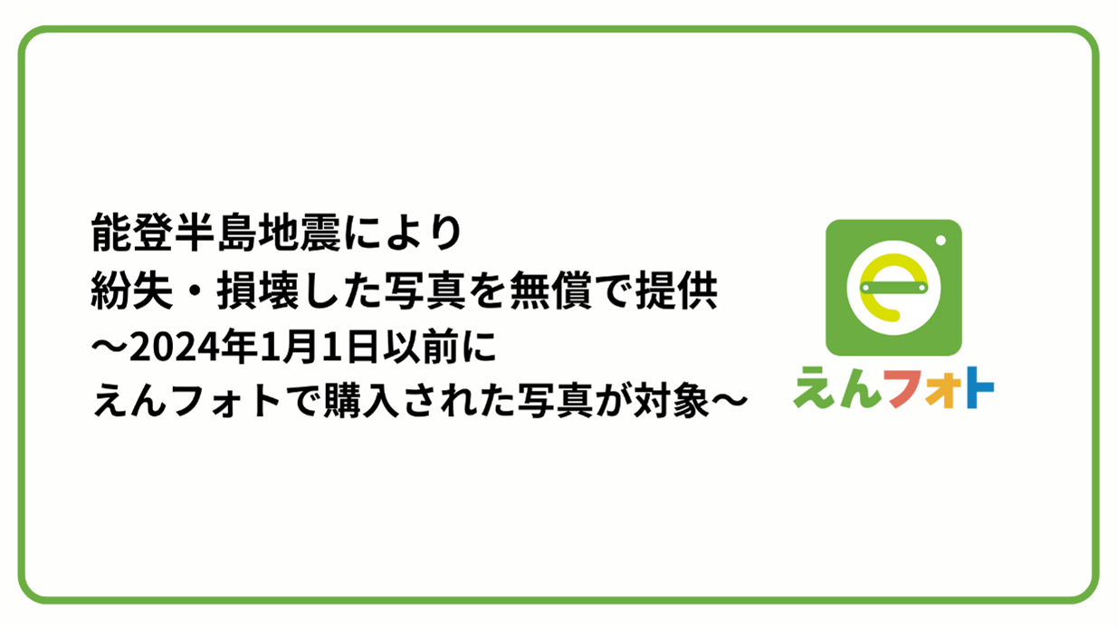 2024年1月1日に発生した「令和6年能登半島地震」では、石川県内だけでも3万棟以上の家屋被害が発生しており、ご自宅などで大切に保管されていた保育園・幼稚園の思い出の写真も紛失・損壊されている可能性が高いことから、この度「えんフォト」では写真の無償提供支援の実施を決定いたしました。