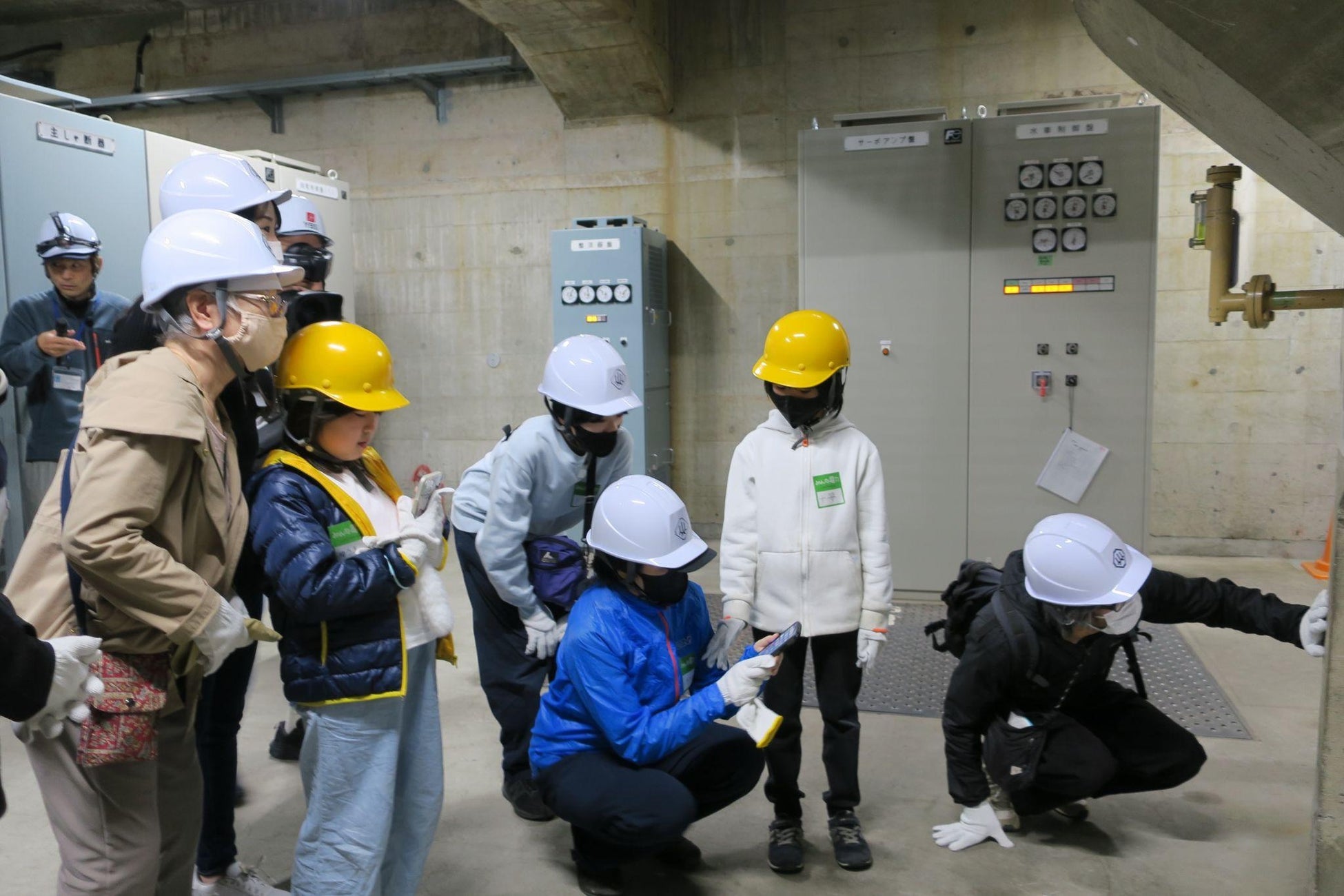 見学中、ちょうど発電を停止するタイミングに遭遇。轟音を立てて回っていた水車発電機が、「バチっ」という大きな音とともに突然静止すると、参加者からは驚きの声が上がりました。電気が止まる瞬間を、音と空気の変化で“体感”する、まさに五感を使った学びの時間です。