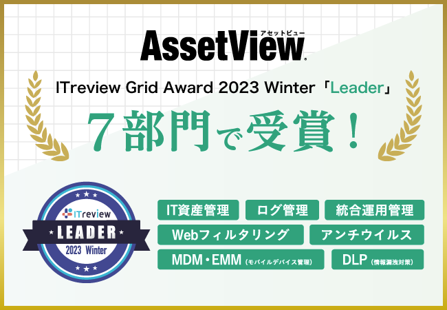 「ITreview Grid Award」とは、「ITreview」で投稿されたレビューをもとに四半期に一度ユーザーに支持された製品を表彰するものです。「AssetView」は7部門【IT資産管理/ログ管理/統合運用管理/Webフィルタリング/アンチウイルス/MDM・EMM(モバイルデバイス管理)/DLP】で「Leader」を受賞しました。