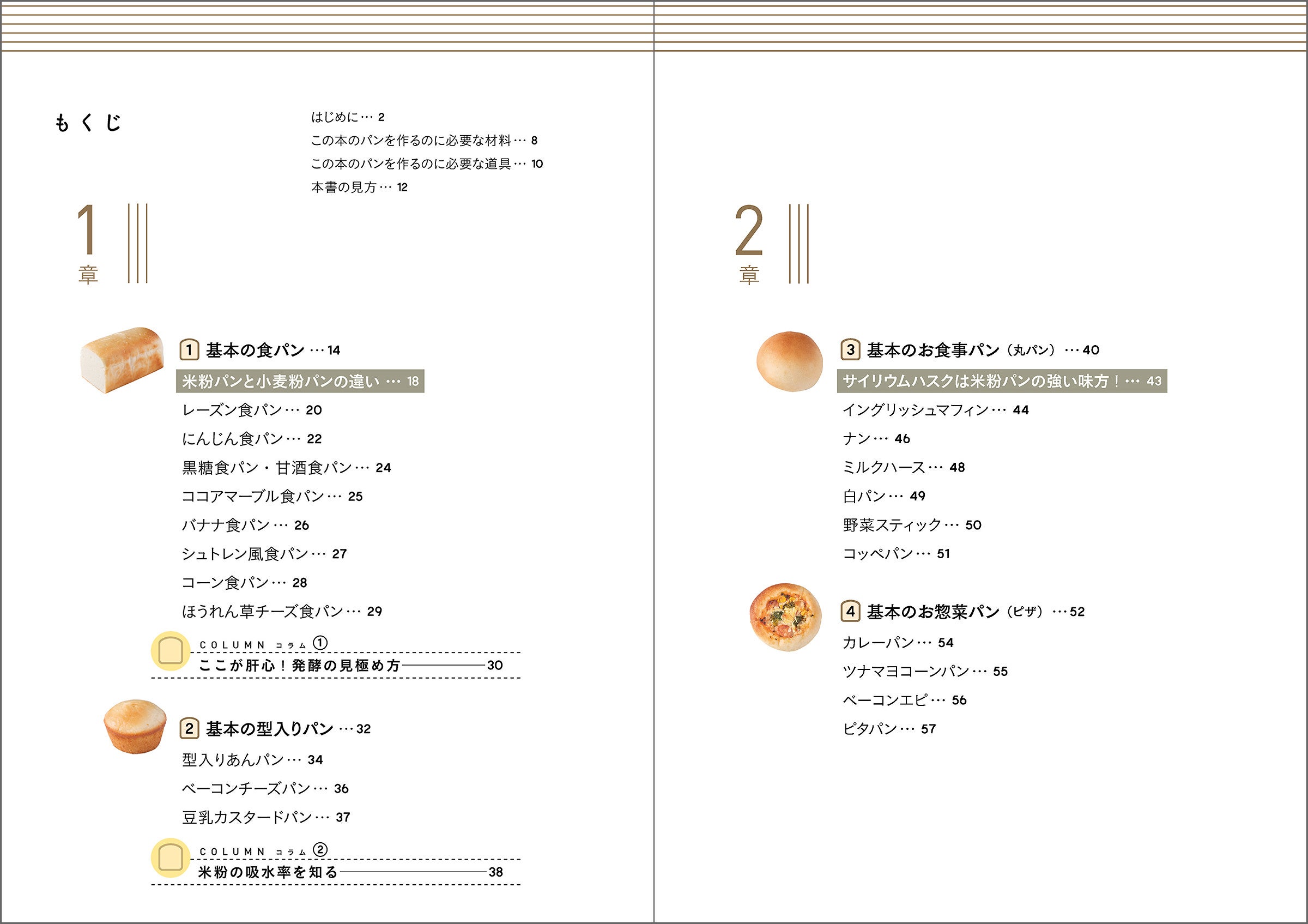同書で紹介するレシピは、小麦粉、たまご、乳、ナッツ不使用の米粉パン51種類。基本の8種類の生地、①「食パン」、②「型入りパン」、③サイリウムハスクを使った「お食事パン」、④「お惣菜パン」、⑤「菓子パン」、⑥「ハードパン」、⑦発酵なしで作れる「豆腐パン」、⑧「豆乳蒸しパン」をマスターすれば、食パンや丸パンはもちろん、イングリッシュマフィンやミルクハース、カレーパン、チョココロネ、カンパーニュまで様々な米粉パンが作れるようになります。