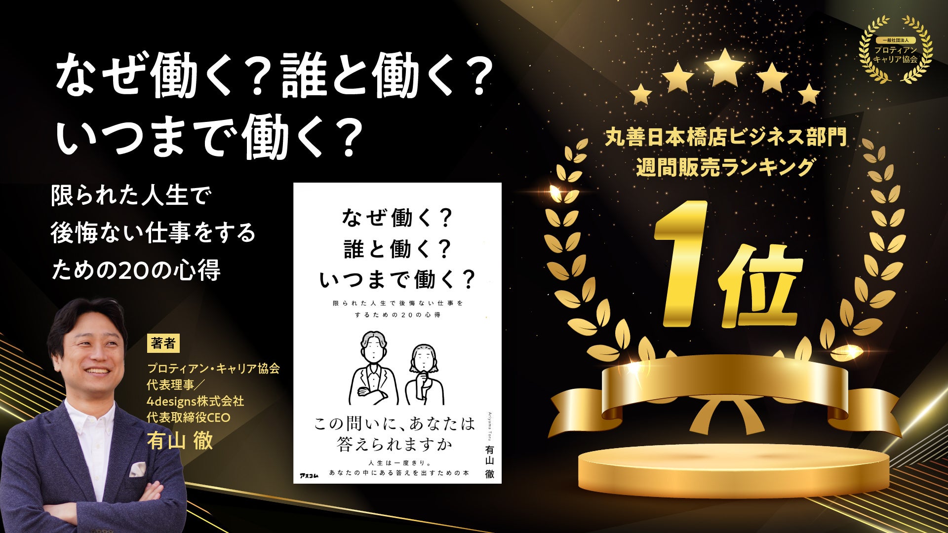 一般社団法人プロティアン・キャリア協会(東京都新宿区、代表理事:田中研之輔・有山徹、以下「当協会」)は、組織と個人のより良い関係構築と個人の主体的なキャリア開発を支援する団体です。このたび、当協会代表理事 /4designs株式会社 代表取締役CEO 有山 徹による新著「なぜ働く?誰と働く?いつまで働く?限られた人生で後悔ない仕事をするための20の心得」が丸善日本橋店の週間販売ランキングのビジネス部門で1位を獲得したことをお知らせします。