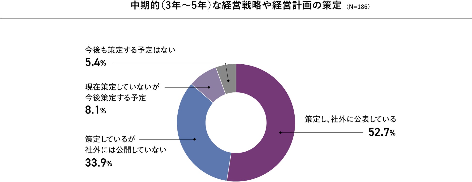 また、33.9%の企業は「策定しているが社外には公開していない」と回答しておりますが、策定は内部での戦略実行に効果的であるものの、外部への情報発信も重要です。「策定していない」「今後も策定する予定はない」と回答した企業は合計で13.5%に。持続的成長のために戦略立案が急務です。