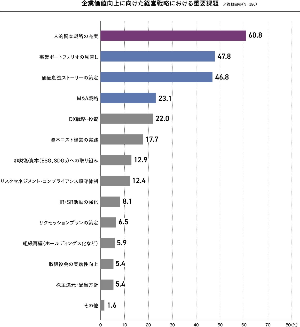 「企業価値向上に向けての経営戦略」として、「人的資本戦略の充実」(60.8%)が最も重視されていることが分かりました。これは、優れた人材の確保と育成が企業価値向上に直結すると考えられているためであると推察できます。次に多かったのは「事業ポートフォリオの見直し」(47.8%)であり、これは経営資源の最適配置と成長分野への集中が求められていることを示しています。