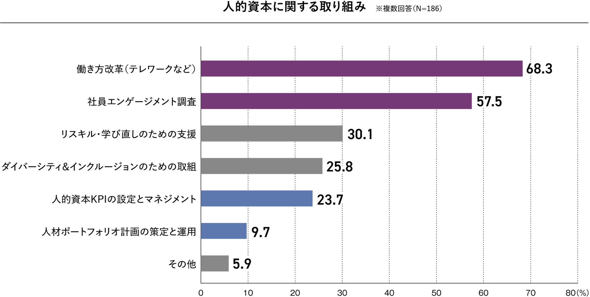 人的資本に関する取り組みの設問では、「働き方改革(テレワークなど)」(68.3%)が最多であり、次いで「社員エンゲージメント調査」(57.5%)が続きました。これにより、柔軟な働き方と従業員の意識向上が重視されていることが分かります。一方で、「人的資本KPIの設定とマネジメント」(23.7%)や「人材ポートフォリオ計画の策定と運用」(9.7%)といった具体的な数値目標や計画の設定は、比較的少ない回答数になりました。総じて、企業は柔軟な働き方と従業員の意識向上に注力しているものの、数値目標や具体的な計画の設定にはさらなる取り組みが求められます。