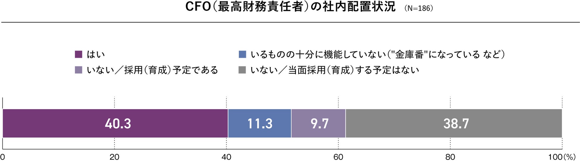 財務戦略を主管するCFOが社内に存在する企業は全体の40.3%であることが分かりました。一方で、11.3%の企業はCFOがいるものの十分に機能していないと回答しています。また、38.7%の企業は「いない/CFOを当面採用(育成)する予定はない」と回答しています。