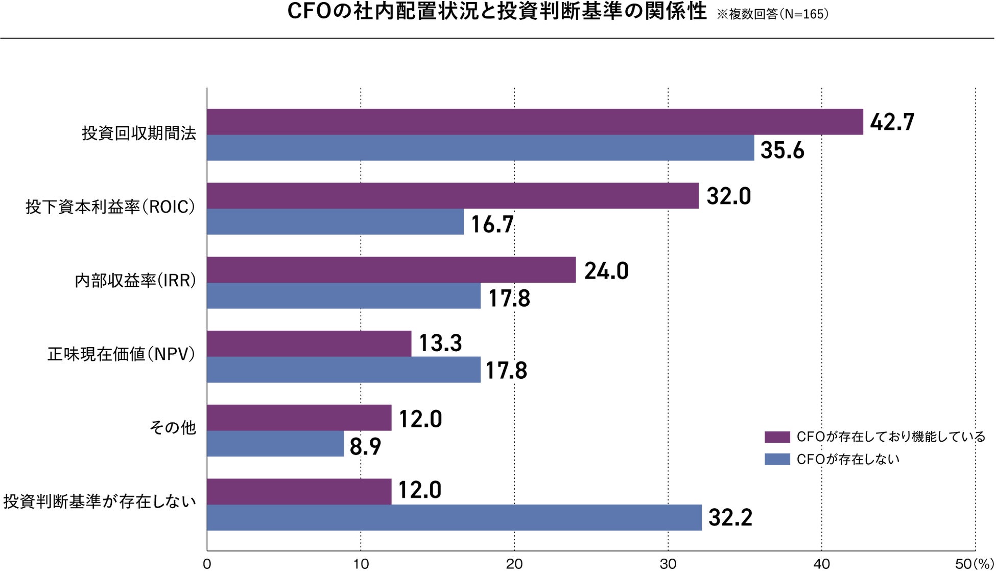 一方で、CFOが存在しない企業は「投資判断基準が存在しない」(32.2%)という回答が多く、統一された投資判断基準が欠如していることで、投資判断の一貫性や精度に課題があると考えられます。したがって、企業価値向上にはCFOの存在とその適切な機能が不可欠であると言えます。