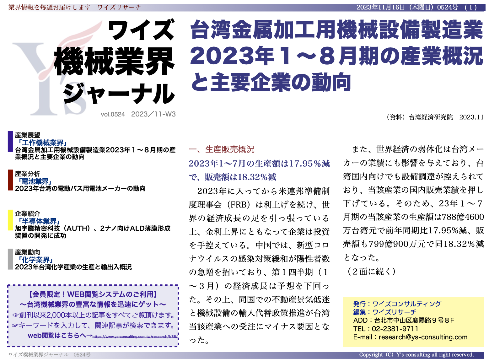 台湾金属加工用機械設備製造業2023年1~8月期の産業概況と主要企業の動向