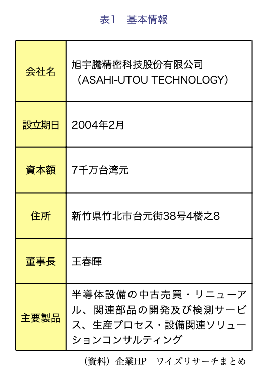 旭宇騰の王春暉・董事長は、半導体製造装置最大手、米アプライドマテリアルズの台湾子会社、台湾応用材料(アプライドマテリアルズ台湾、AMT)で10年務めた人物だ。AMTではチームリーダーとして装置の設置やテスト、修理などを手掛け、徳碁半導体(現在のTSMC第7工場)やモセルの8インチウエハー工場建設などにも携わった。2004年に旭宇騰を創設し、アプライドマテリアルズ向けの設備改造・保守サービスなどを手掛けてきた。