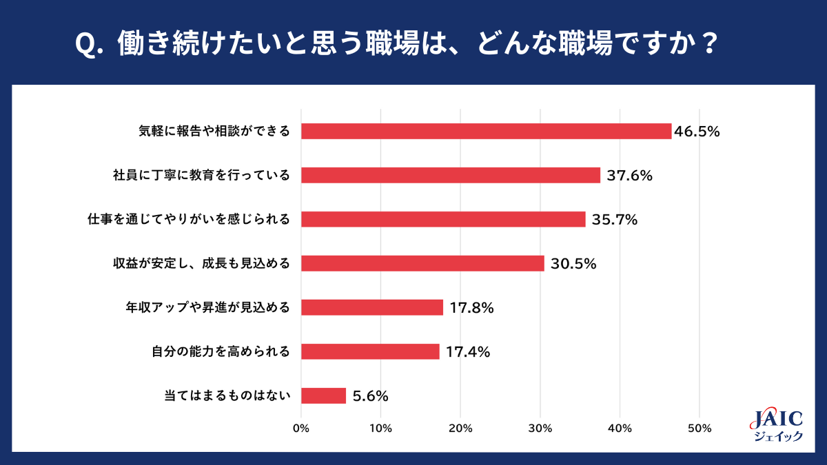 「働き続けたいと思う職場は、どんな職場ですか」と質問したところ、1位「気軽に報告や相談ができる」が46.5%、2位「社員に丁寧に教育を行っている」が37.6%、3位「仕事を通じてやりがいを感じられる」が35.7%、となりました。