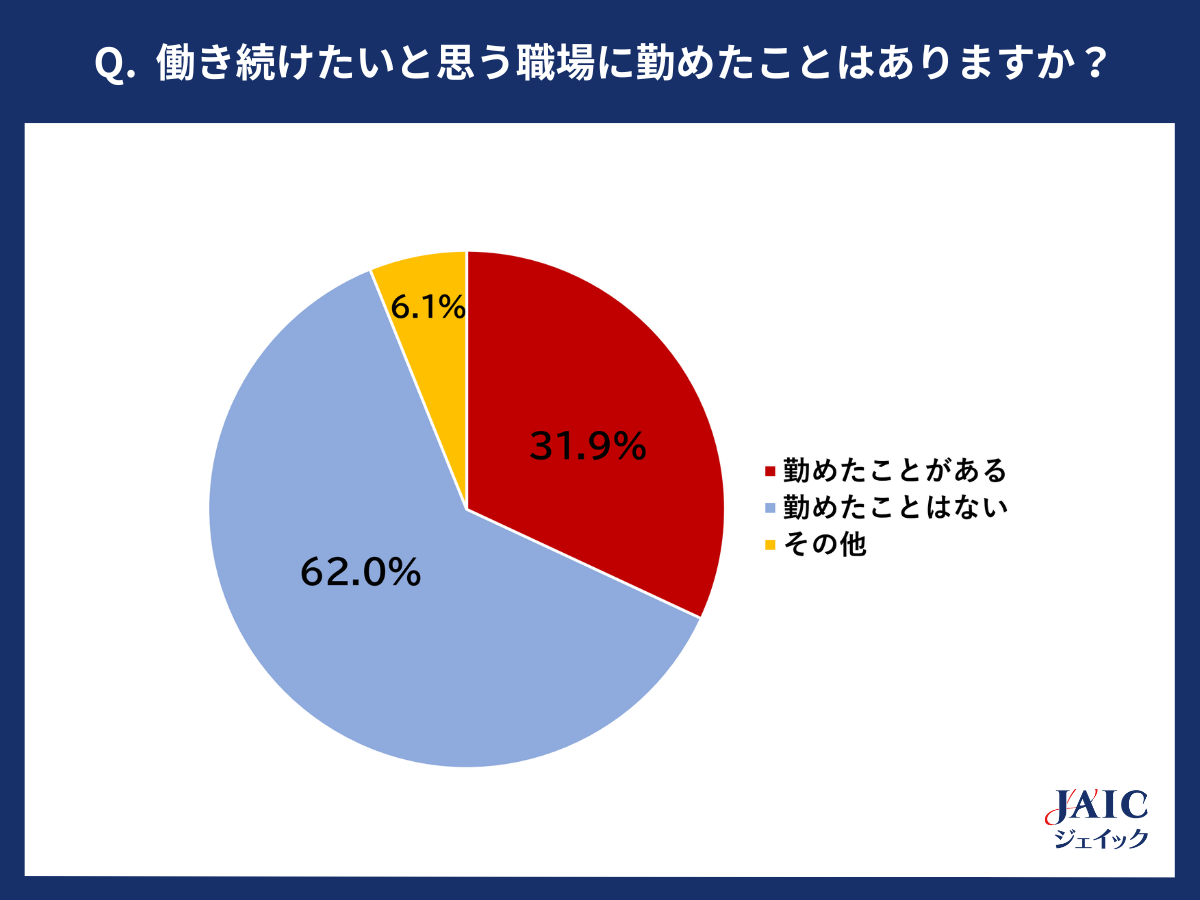 「働き続けたいと思う職場に勤めたことはありますか?」と質問したところ、「勤めたことはない」が62.0%、「勤めたことがある」が31.9%となりました。