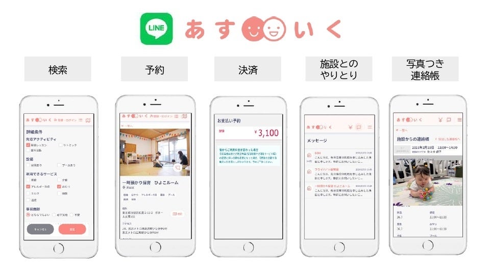 ちょっとお子さまを誰かに見ていてほしいとき、LINEから24時間365日、1分で保育施設を検索、予約できるのが「あすいく」です。保護者のひとり時間の創出に貢献できるプラットフォームで、電話や紙が中心である一時保育の予約や現地決済を、「あすいく」でペーパーレス、キャッシュレス、電話レスを実現しています。