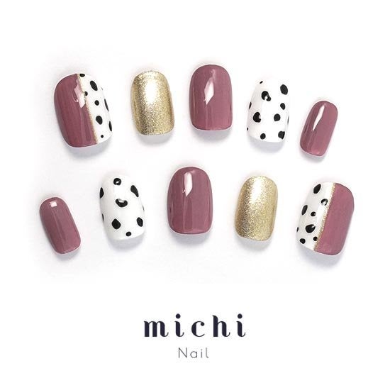 ダルメシアン柄とゴールドが目を惹くこちらのネイル。プラムピンクが女性らしさをプラスして、全体的に可愛らしく仕上がっています。カジュアルとガーリーのいいとこどりで、様々なファッションに合わせていただけます!