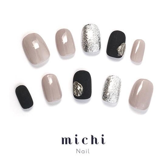 ブラック×シルバー×グレージュのエレガントで洗練された大人の女性向けのネイル。艶とマットとラメの3種類が一度に楽しめる満足度の高いデザインです。カラーがシンプルなので、飽きずに毎日使えるのも魅力です!