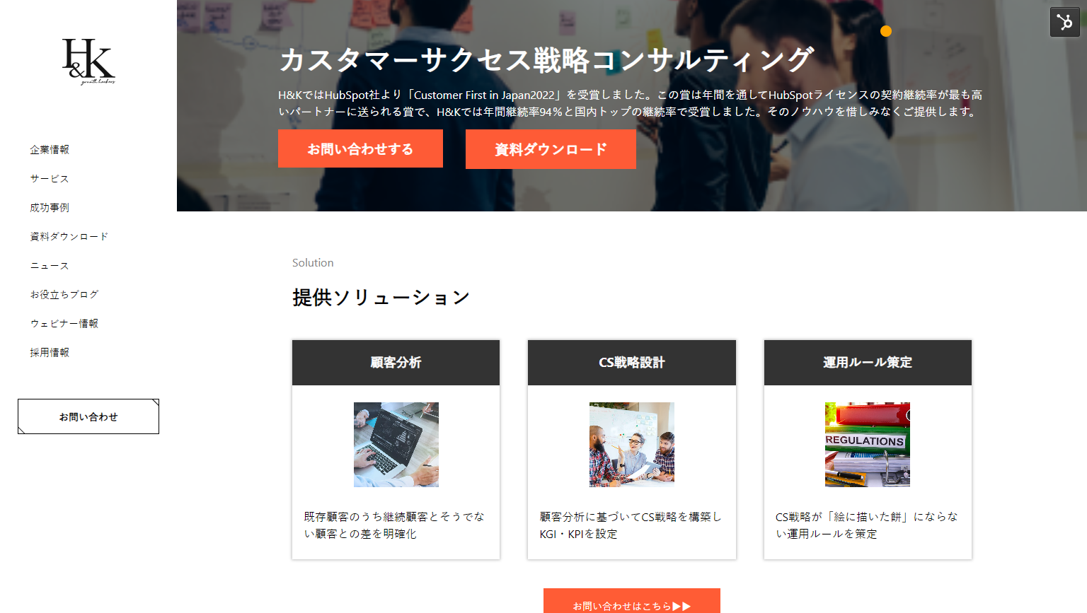 H&Kは実際にHubSpot社から「Customer First in Japan2022」を受賞し国内パートナー200社以上の中で年間継続率94%という国内トップのカスタマーサクセスの実績があり、蓄積したノウハウを提供することができます。