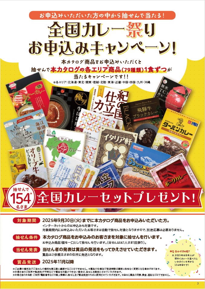 さらに、「2024年全国カレー祭り(下期)」に続き、商品をお申込みいただいた方から抽せんで154名さまに、本カタログに掲載している北海道から沖縄までの「エリア商品(79種類)」を1食ずつセットにした「全国カレーセット」をプレゼントするキャンペーンを行います。