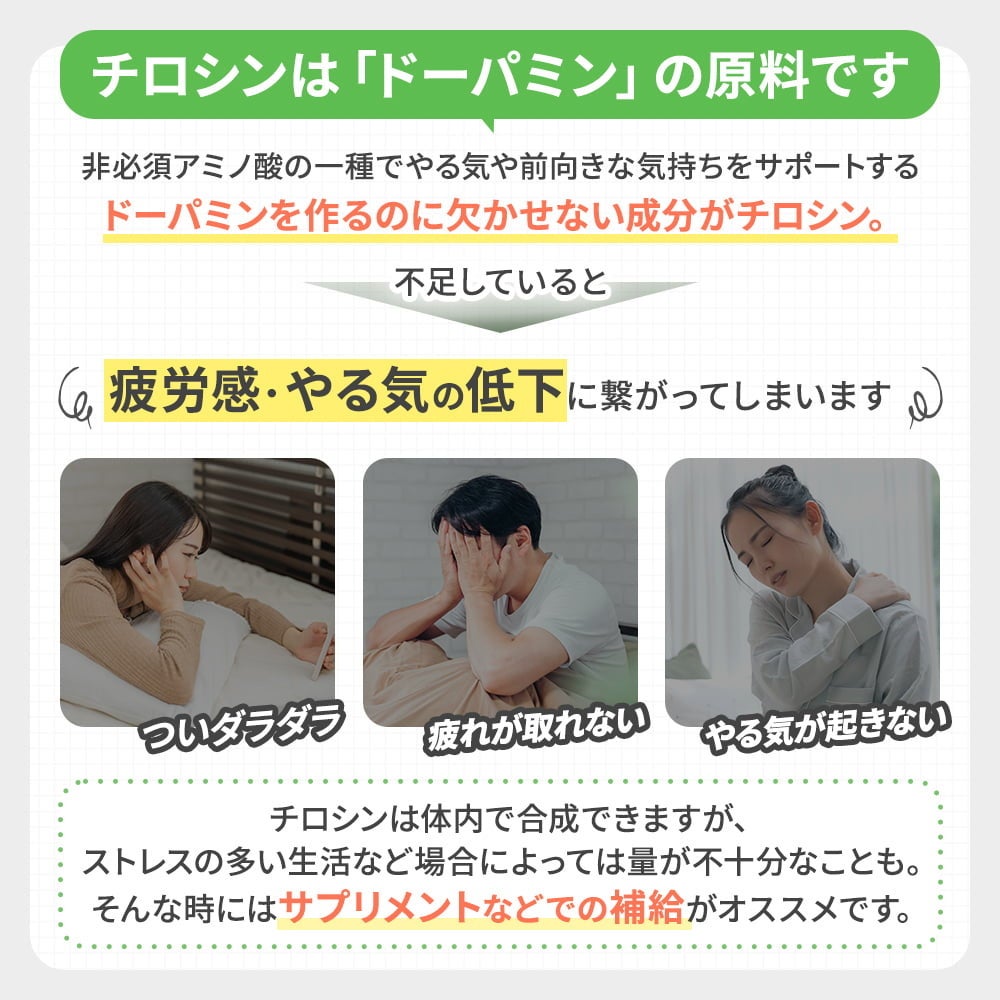 チロシンはドーパミンの原料となる非必須アミノ酸の一種で、チロシンが不足しているとドーパミンが不足して疲労感を感じたり、やる気の低下につながります。ストレスの多い毎日で不足しがちなチロシンを、パウダー状で手軽に摂取可能にすることでパフォーマンスアップにつながります。