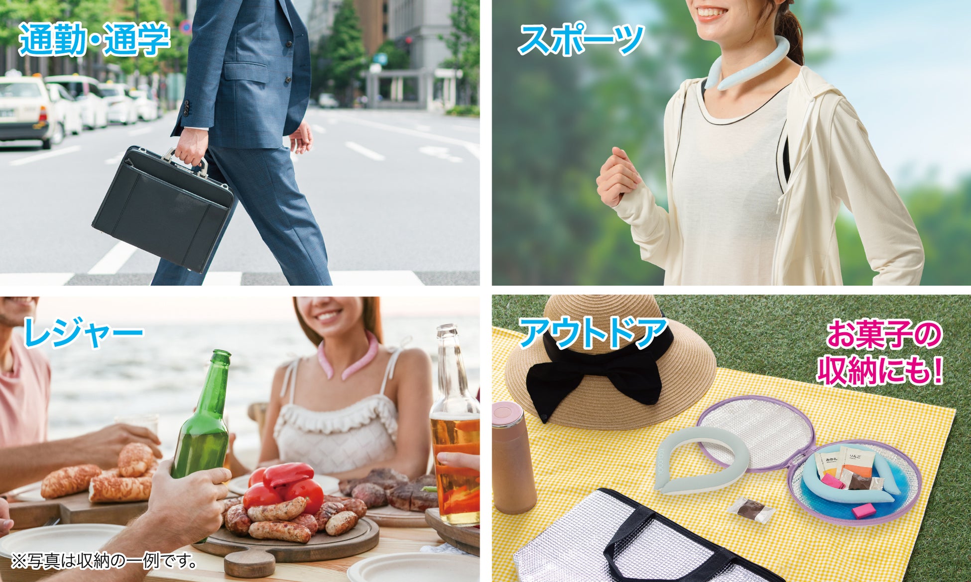 ネックリングの持ち運びはもちろん、熱に弱い化粧品やお菓子などの小物収納もできます。