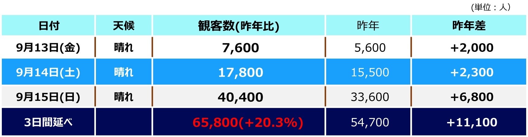 ※ 13日(金)7,600人-晴れ、14日(土)17,800人-晴れ、15日(日)40,400人-晴れ