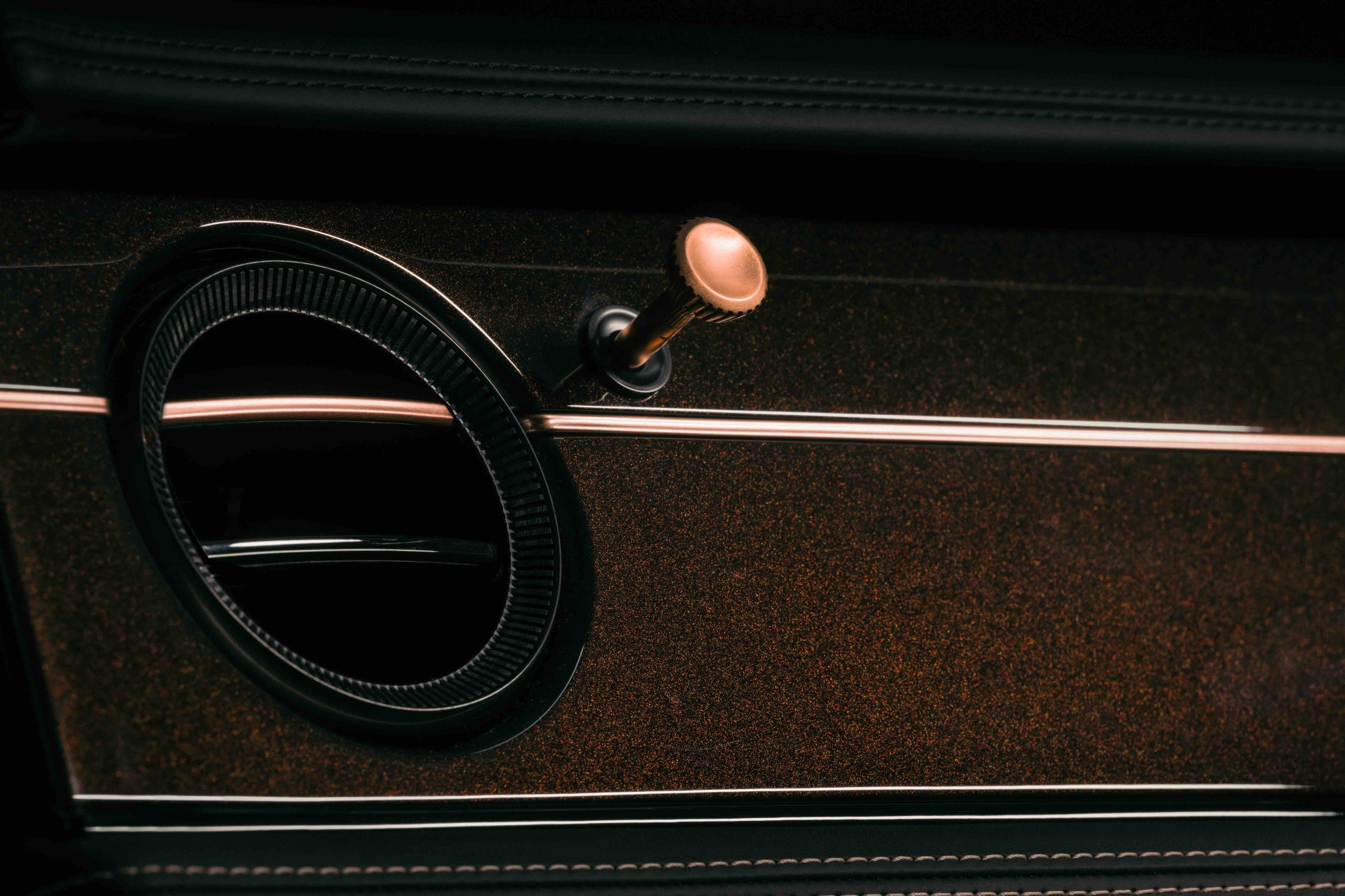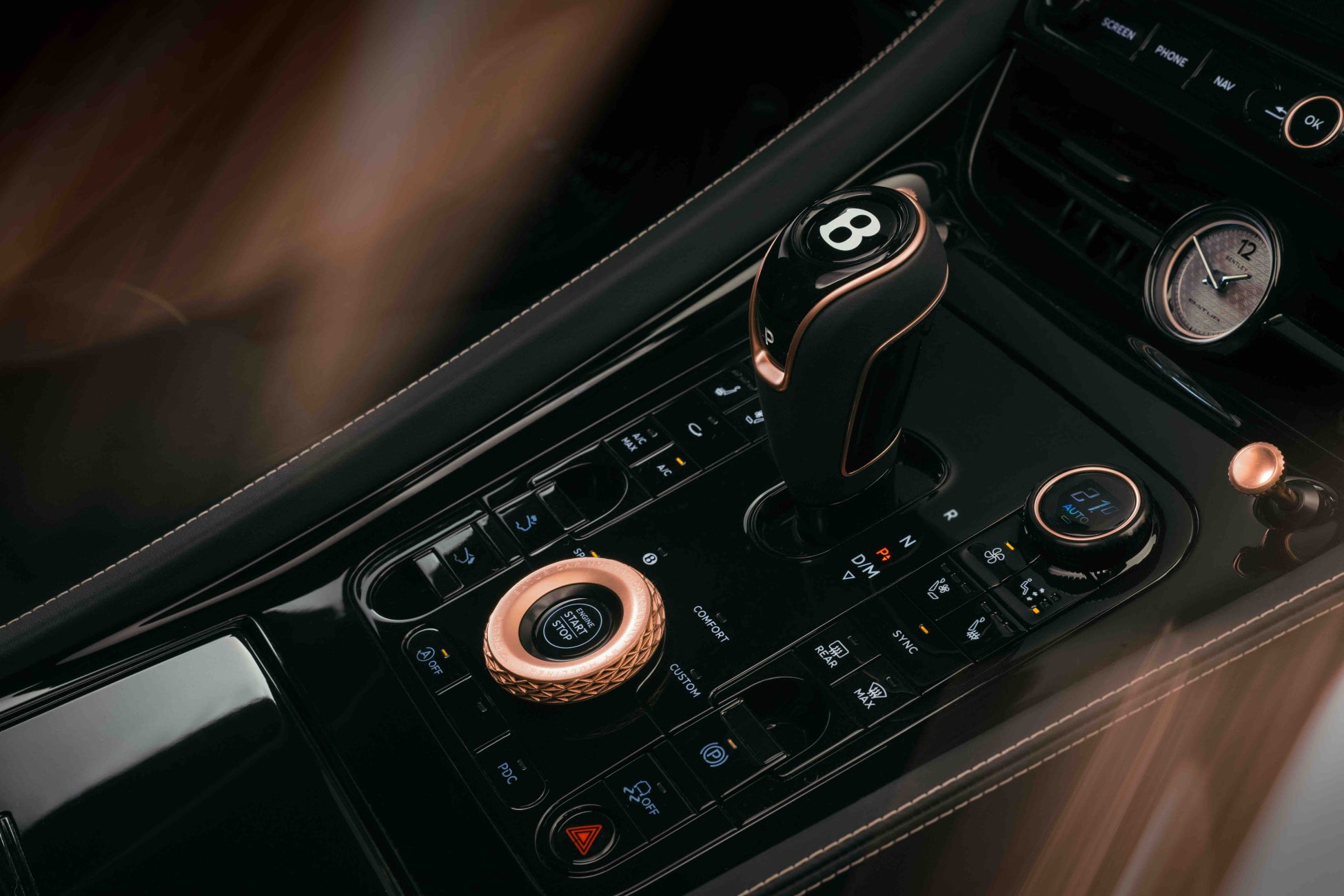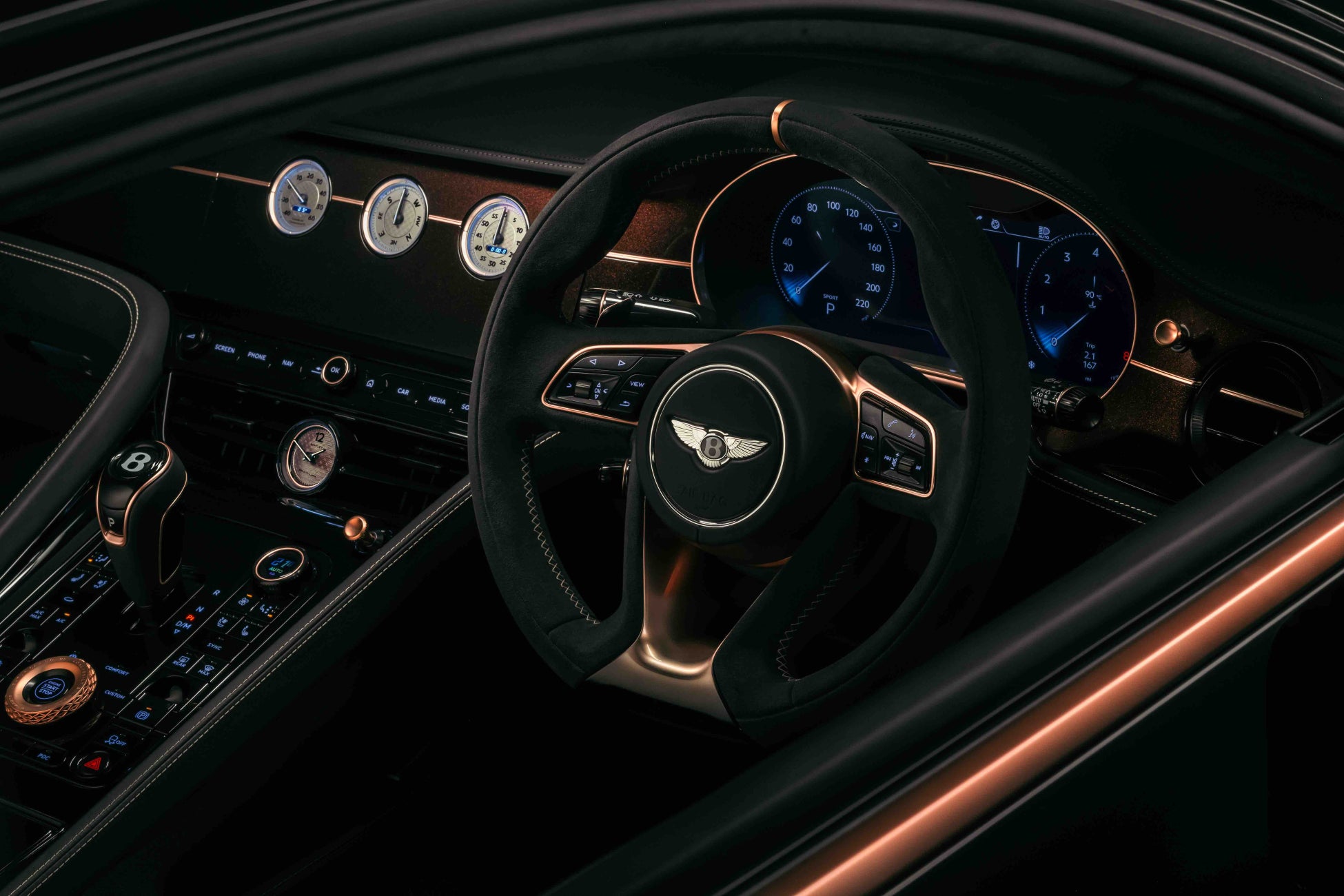 キャビンに足を踏み入れると、深みのあるダークトーンのレザー、ファシア、ファブリック素材が広がり、その中でローズゴールドの輝きが際立ちます。自動車業界初となる金属を層ごとに積み重ねて精密なパーツを作り出す革新的な製造方法であるベントレーの金属積層造形(AM)3Dプリンティング技術により、最大210グラムのホールマーク付き18Kローズゴールドが随所にあしらわれています。ドライバーモードセレクターや、ベントレーの象徴であるオルガンストップ式のエアベントコントロール、さらにステアリングホイールのローズゴールド製インサートマーカーなど、運転時に触れる主要なポイントに施され、ビスポークの精緻なクラフツマンシップを際立たせています。
