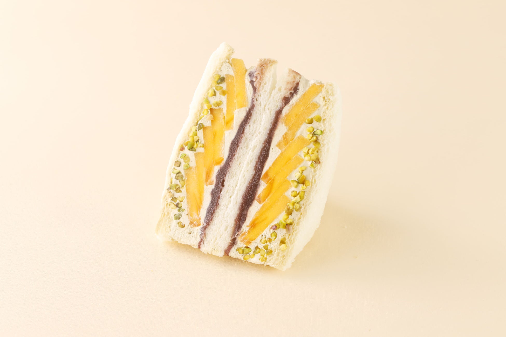 甘みたっぷりの旬の柿を、香ばしいほうじ茶クリームとこしあんでサンドし、上品な味わいに仕上がっています。ピスタチオの色みと食感もアクセントに。