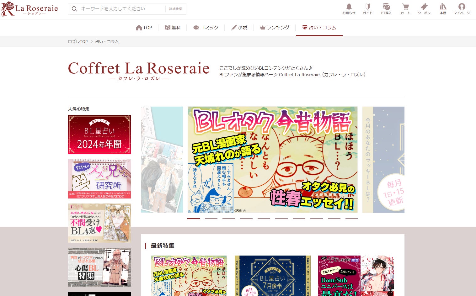 BLファンが集まる情報ページ「Coffret la Roseraie(カフレ・ラ・ロズレ)」では、人気占い師・湊きよひろ先生によるBL星占い、リスちゃんの熱量満点コラム、BL情報サイト「ちるちる」さん監修のオリジナル特集など、ここでしか読めないBLコンテンツが盛りだくさんです!