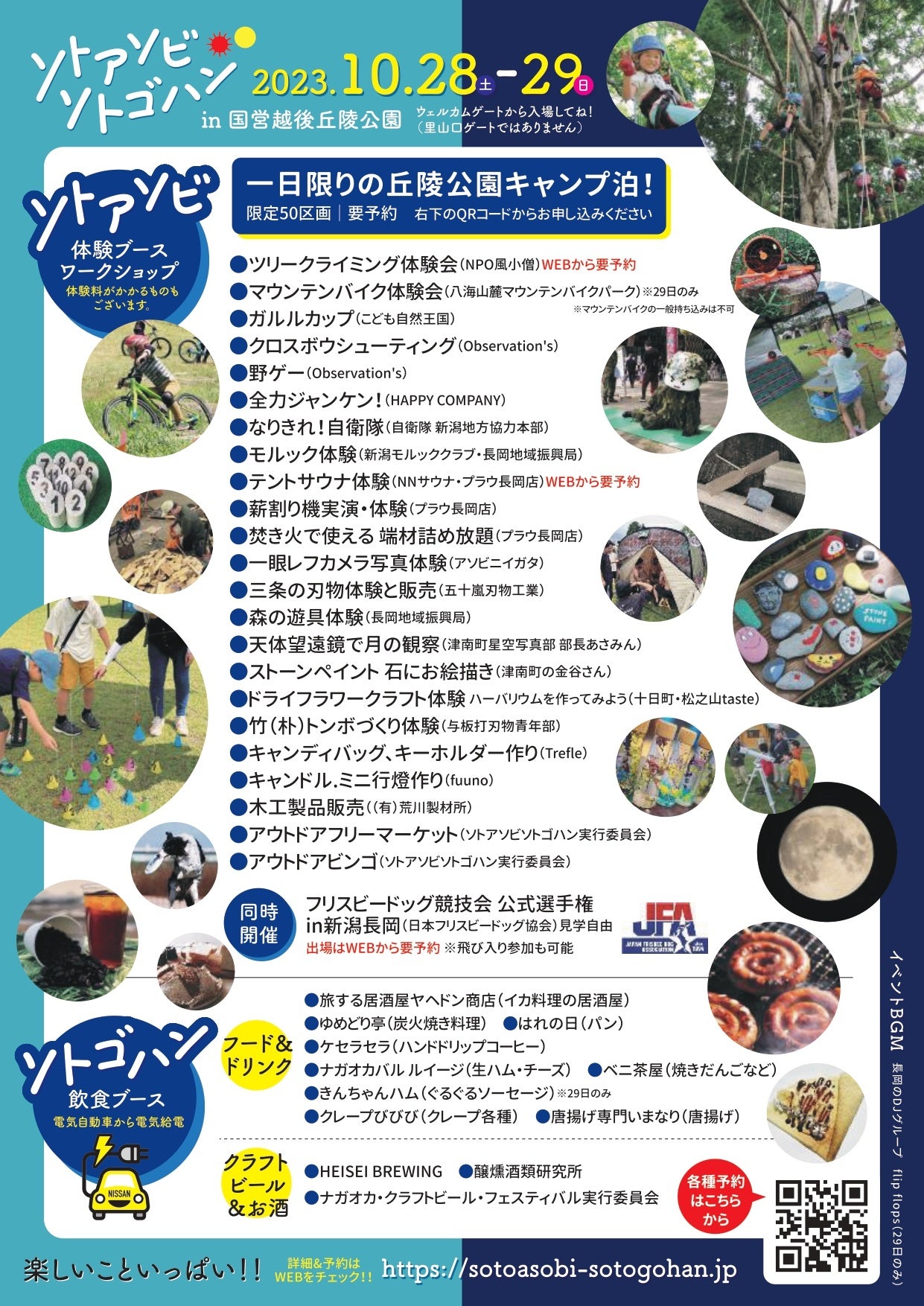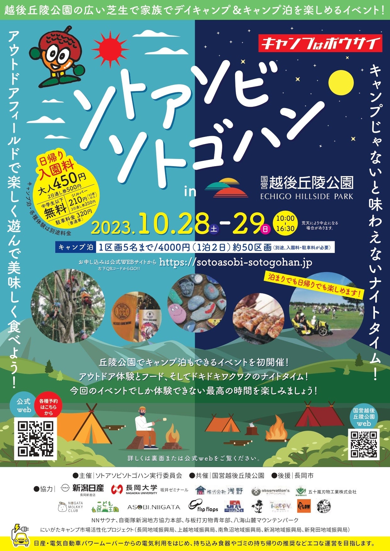 ソトアソビソトゴハンは今回で4か所目となります。秋のキャ ンプシーズンに、新潟県民が、身近な自然で遊び、気軽に楽しむ 姿を発信することで、新潟のアウトドアシーンを盛り上げていき ます。多くの皆様のご参加をお待ちしております。