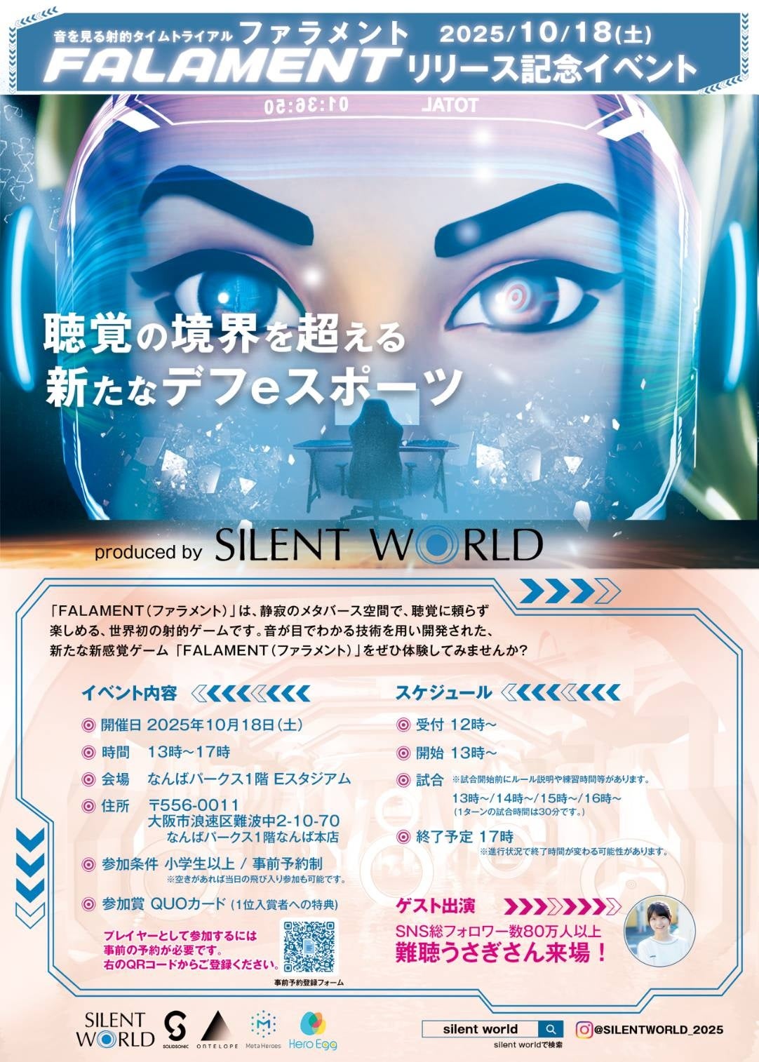 株式会社Meta Heroes(本社所在地:大阪府大阪市、代表取締役:松石和俊、以下「当社」)は、ソリッドソニック株式会社(兵庫県神戸市、代表取締役:久保貴弘)、株式会社ASTOLTIA(東京都渋谷区、代表取締役:若林祐衣)、株式会社オンテロープ(東京都新宿区、代表取締役:澤田真吾)と共同で開発したメタバースゲーム『FALAMENT』(ファラメント)の体験イベントを2025年10月18日(土)と11月8日(土)に開催いたします。