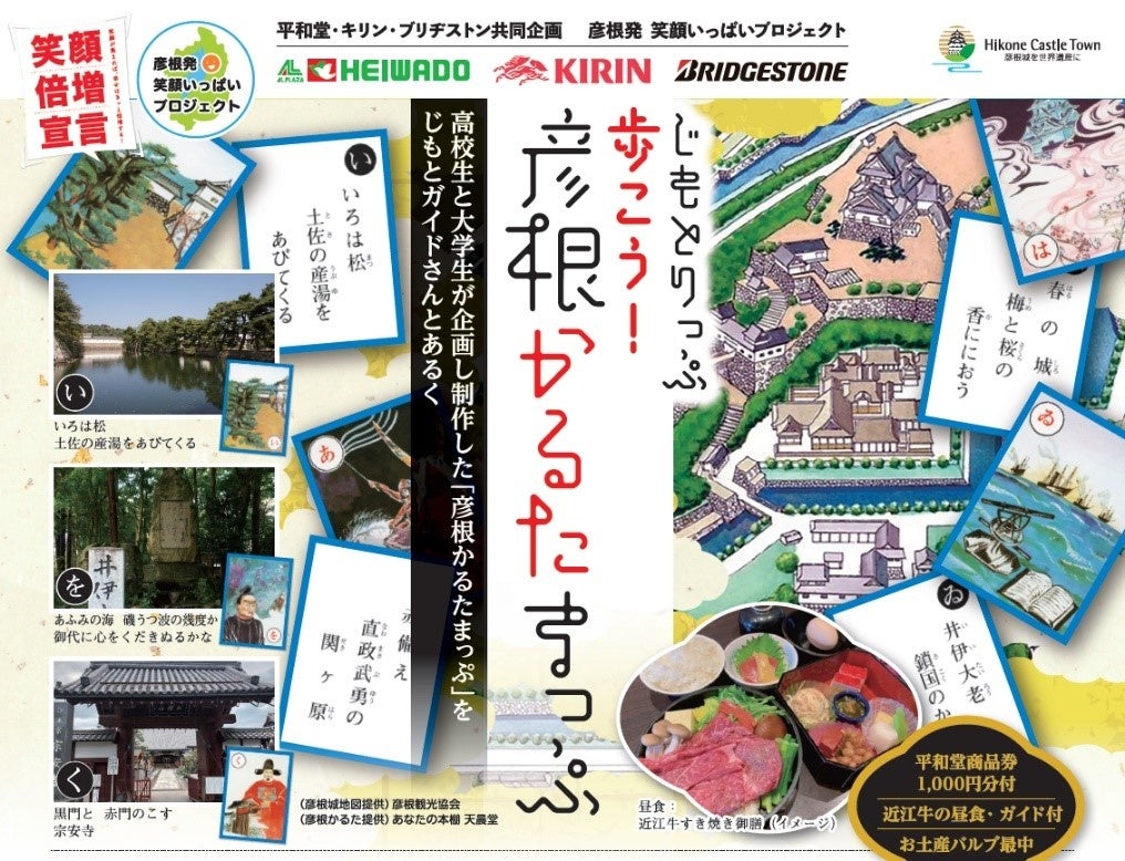 株式会社平和堂、キリンビール株式会社(滋賀工場)、株式会社ブリヂストン(彦根工場)(以下、3社を「HKB」)は、2022年度に実施した取り組みで、高校生のアイデアをもとに滋賀大学が企画・製作した「彦根かるたまっぷ」と、平和堂直営旅行センターが主催する「じもとガイドさんと巡るまちあるきツアー『じもとりっぷ』」がコラボした企画として、実際に彦根城と周辺を街歩きする「じもとりっぷ 歩こう!彦根かるたまっぷ」の参加者を募集いたします。