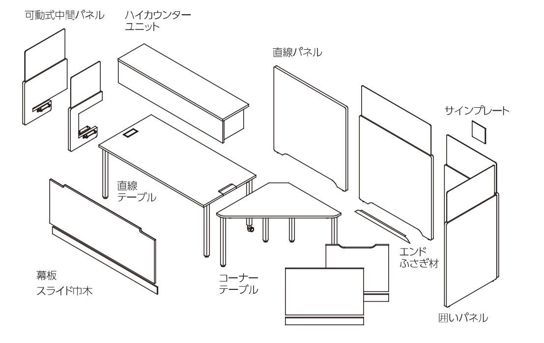 「koloka」は、本体とパネルの組み合わせで、ハイカウンター・ローカウンター・相談ブース・総合受付・打ち合わせテーブルなど、窓口のスタイルに合わせて形状変更が可能です。