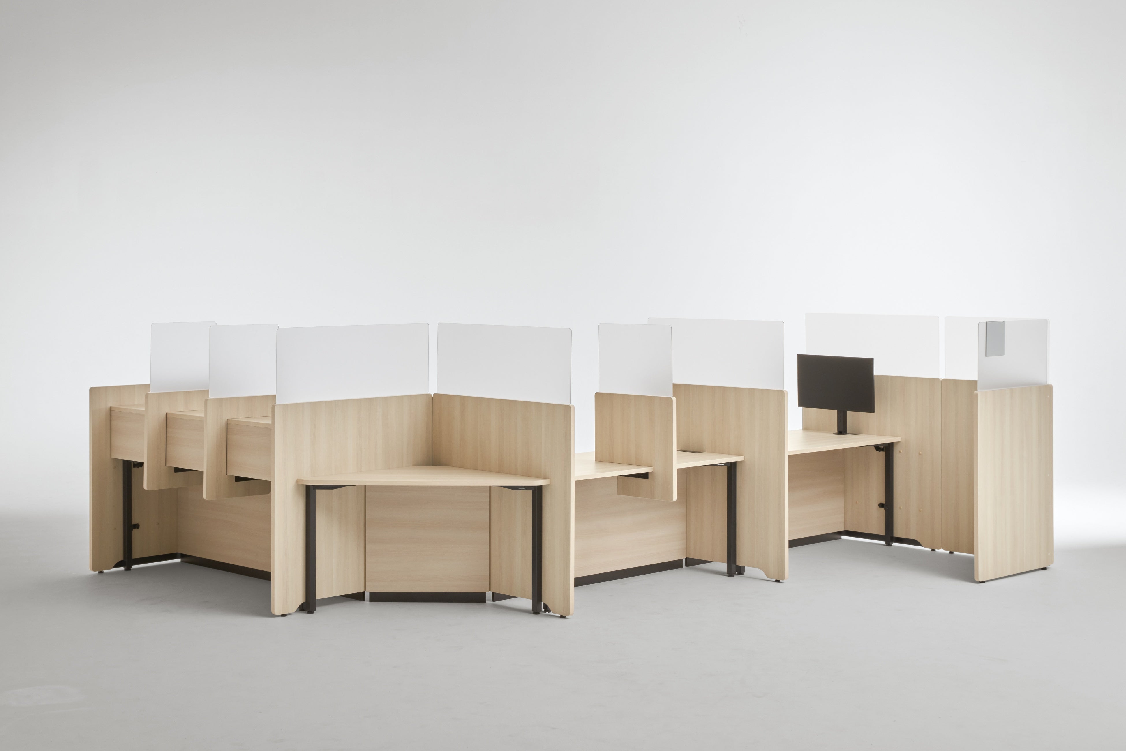 本体天板・パネル・ハイカウンターユニットには、公共性の高い場所でニーズの高い、抗菌・抗ウイルス性能メラミン化粧板を採用しています。可動式中間パネルは、高い自由度で取り付けることができるため、プライバシーに配慮した窓口の数を容易に増減できます。L字型の囲いパネルを追加設置すると、視線が遮られより落ち着いた空間になります。