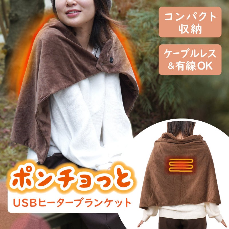 ちょっと肌寒いときに暖まりたい。秋冬のお出かけ時にバッグに防寒具を入れておきたい。そんな方におすすめの「USBヒーターブランケット「ポンチョっと」」です。