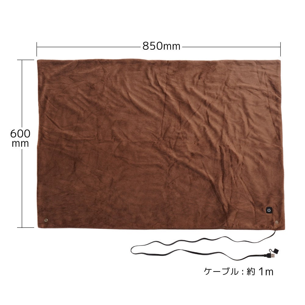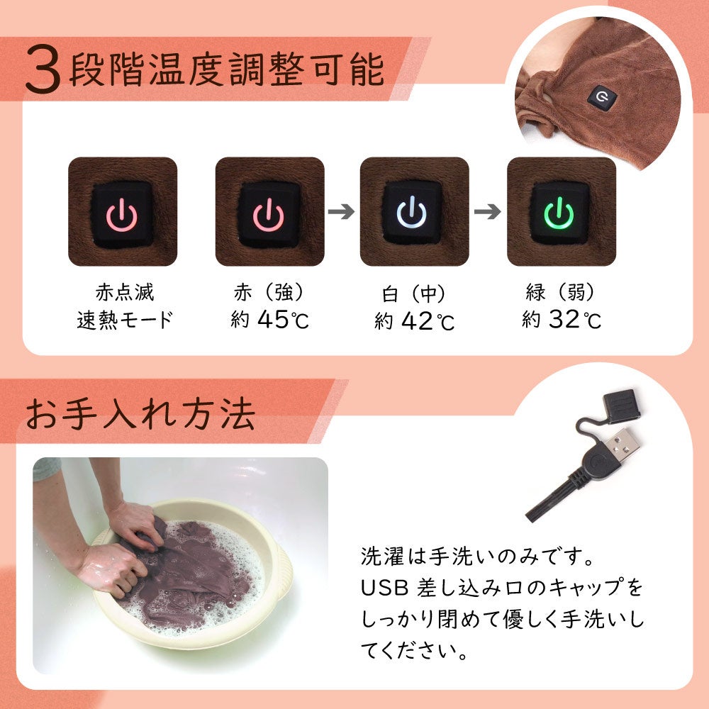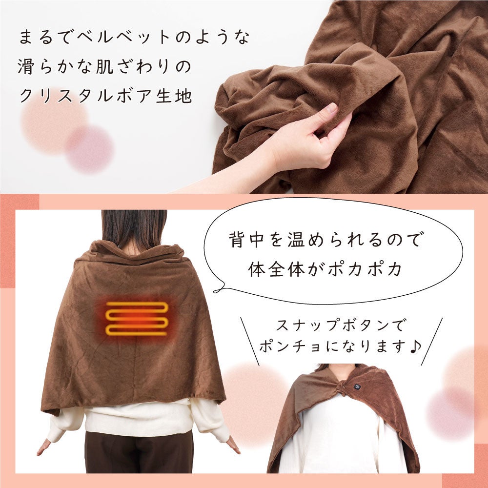 電源を入れると自動で10分間は速熱モードになり、ボタンを押すごとに3段階(強約45度、中約42度、弱32度)の温度切り替えが可能。肌触りの良いクリスタルボア生地を採用。端にあるスナップボタンを留めればポンチョのように羽織って使うことも可能。電源はUSB給電式でモバイルバッテリーでもお使いいただけます。