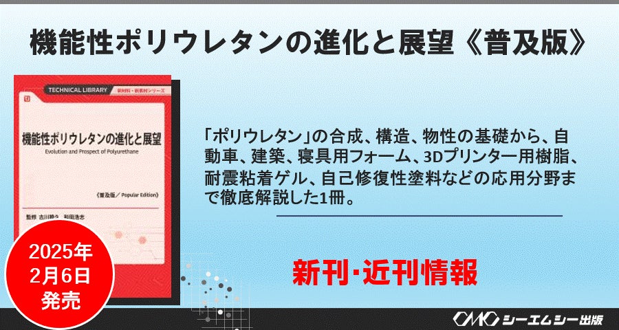 株式会社シーエムシー出版は、『機能性ポリウレタンの進化と展望《普及版》(監修:古川睦久、和田浩志)』(定価:税込5,610円)を2025年2月6日に発刊いたします。詳細については以下をご覧ください。