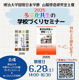 明治大学国際日本学部の山脇啓造研究室(専門:多文化共生論)は6月28日(土)に「多文化共生の学校づくりセミナー」を、対面とオンラインで聴講可能なハイブリット形式で行います。聴講は事前申込制です。