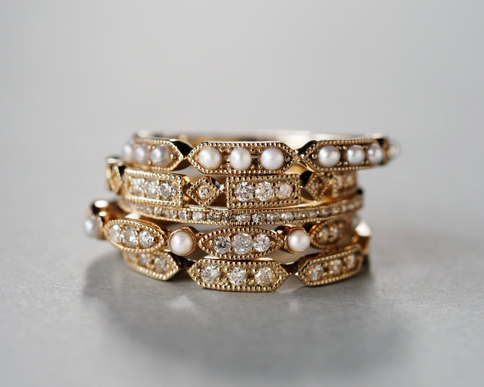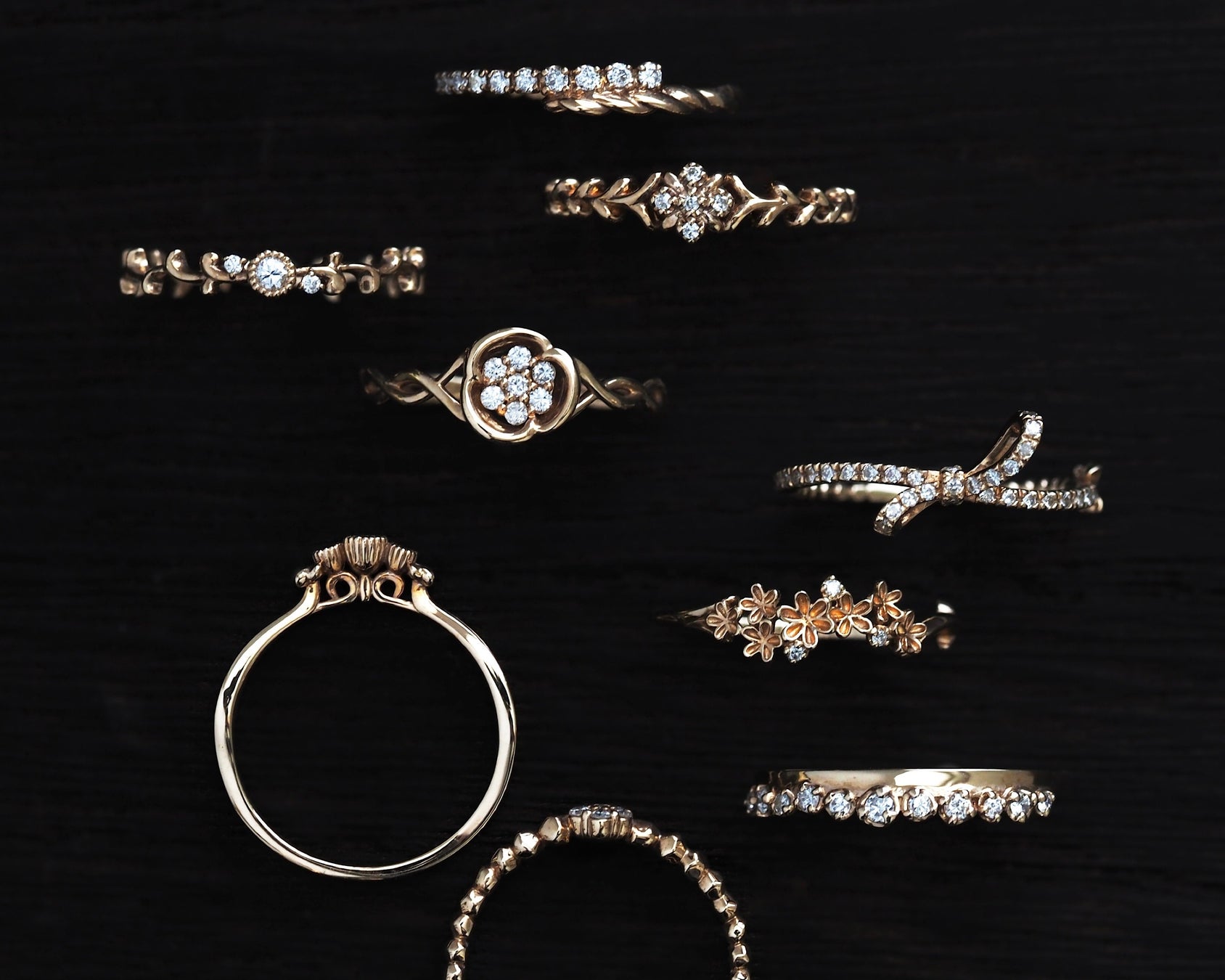 ダイヤモンドを美しく並べ、デザインごとに異なるこだわりが詰まっています。石の配置や地金のふくらみに至るまで、繊細な設計が施されており、一本ごとに異なる個性が光ります。
