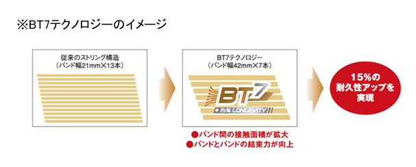 新製品のこのストリングはナチュラルストリングの構造そのものを革新するBT7テクノロジー※を新たに採用し、ストリングの原料となるバンド(帯状の牛の腸)を従来の21mm幅13本から、42mm幅の7本に変更しました。これによりそれぞれのバンド間の接触面積が増え、結束力が高まり、ナチュラルストリング本来の優れた特性を損なうことなく、耐久性を向上しました。